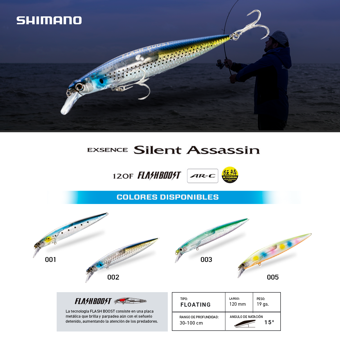 Diseñado para la pesca de corvina, pero igualmente adecuado para otros depredadores , el Silent Assassin tiene un pedigrí mundial, que se mejorará aún más con la inclusión de Shimano FLASH BOOST. Con la tecnología de peso móvil Shimano AR-C / JET BOOST para aumentar la distancia de lanzamiento y mejorar la precisión. Usando una recuperación constante regular, el Silent Assassin FLASH BOOST tiene una acción de balanceo apretada, pero se puede agregar una acción agresiva usando tirones bruscos o una acción de deslizamiento usando tirones largos de la punta de la caña. La versión floating también funciona bien cuando se detiene y se deja flotar lentamente hacia la superficie, antes de volver a bajar a su profundidad de trabajo. También se agrega una mayor atracción mediante el uso de la película holográfica Kyorin / SCALE BOOST 3D que brinda un patrón muy realista.